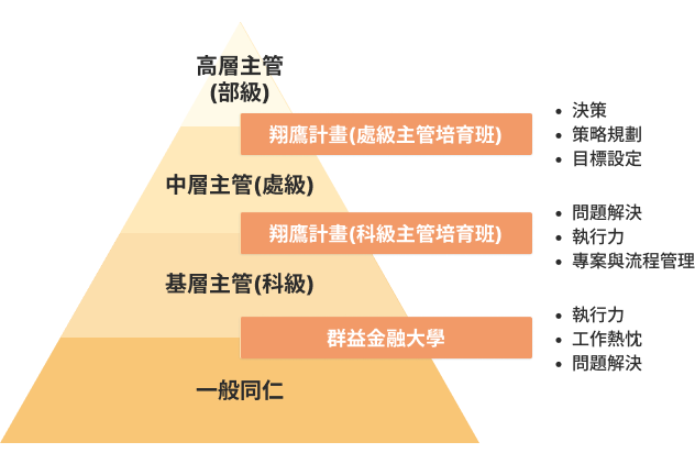 - 關鍵職能層:配合公司永續金融業務發展方向,持續盤點關鍵職務所需之永續金融專業能力,作為後續人才培育與配置之參考依據。